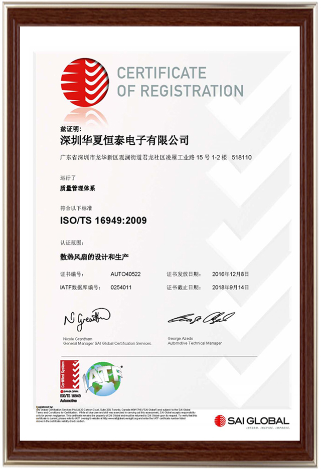 ISO/TS 16949:2009證書的獲得,使我司成為國(guó)內(nèi)為數(shù)不多獲得TS16949認(rèn)證的散熱風(fēng)扇制造企業(yè)。